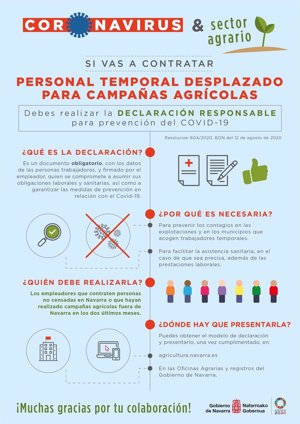 Tras un año de implementación del protocolo de declaración responsable y control sanitario de los trabajadores a raíz de la crisis del Covid-19, el objetivo para 2021 es que se agilice por parte de las personas o entidades contratantes la cumplimentación y tramitación de las declaraciones responsables, debido sobre todo a la escasa duración de algunos de los contratos, ha detallado el Gobierno navarro.